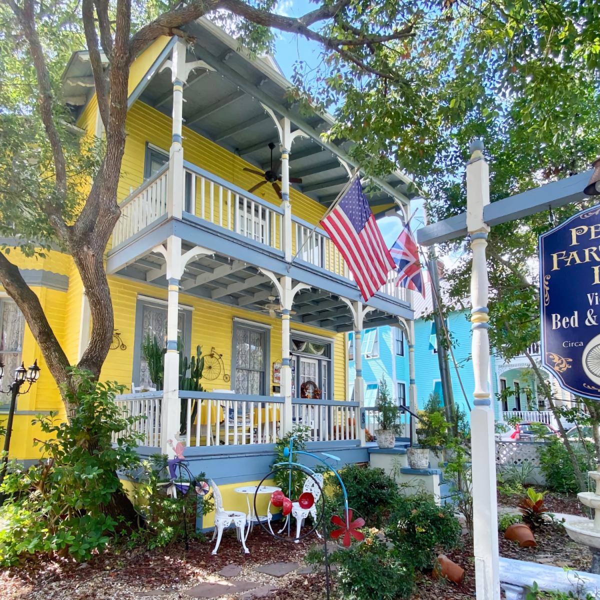 Penny Farthing Inn is located in St. Augustine, Florida, with nine rooms available to guests. Much of the furniture and couches inside the property are from the 1800s when the property was first built. The owners have tried to keep the historical components of the inn since acquiring it. Several trees surround the property, providing shade for guests who may want to be outdoors. The inn is three stories high with a separate building on the property that reaches two stories high. The second building includes five rooms, while the main inn includes the other four rooms dispersed among the second and third floors. Five of the units feature queen-size beds and the other four have king-size beds. Furthermore, five of the nine rooms have balconies. Amenities may vary depending on the room, though each room includes Wi-Fi, an ironing board, TV, hairdryer, and complimentary wine, to name a few. The owner notes that the Victoria Bedchamber is typically the most popular room, mainly because previous occupants have enjoyed the balcony at the front of the house. The main common area where guests typically socialize and lounge is the outside porch area, which can fit about 10-14 occupants.